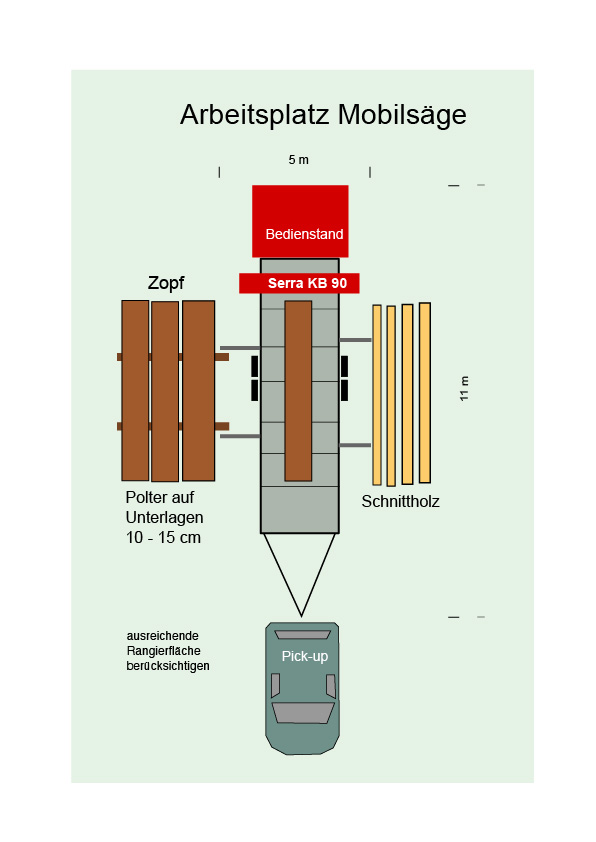 Der Sägeplatz sollte mind. 6 x 13 m + Rangierfläche möglichst waagerecht und mit dem PKW befahrbar sein.