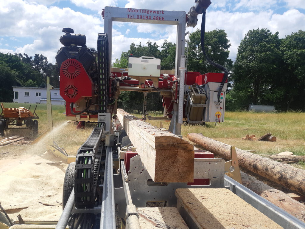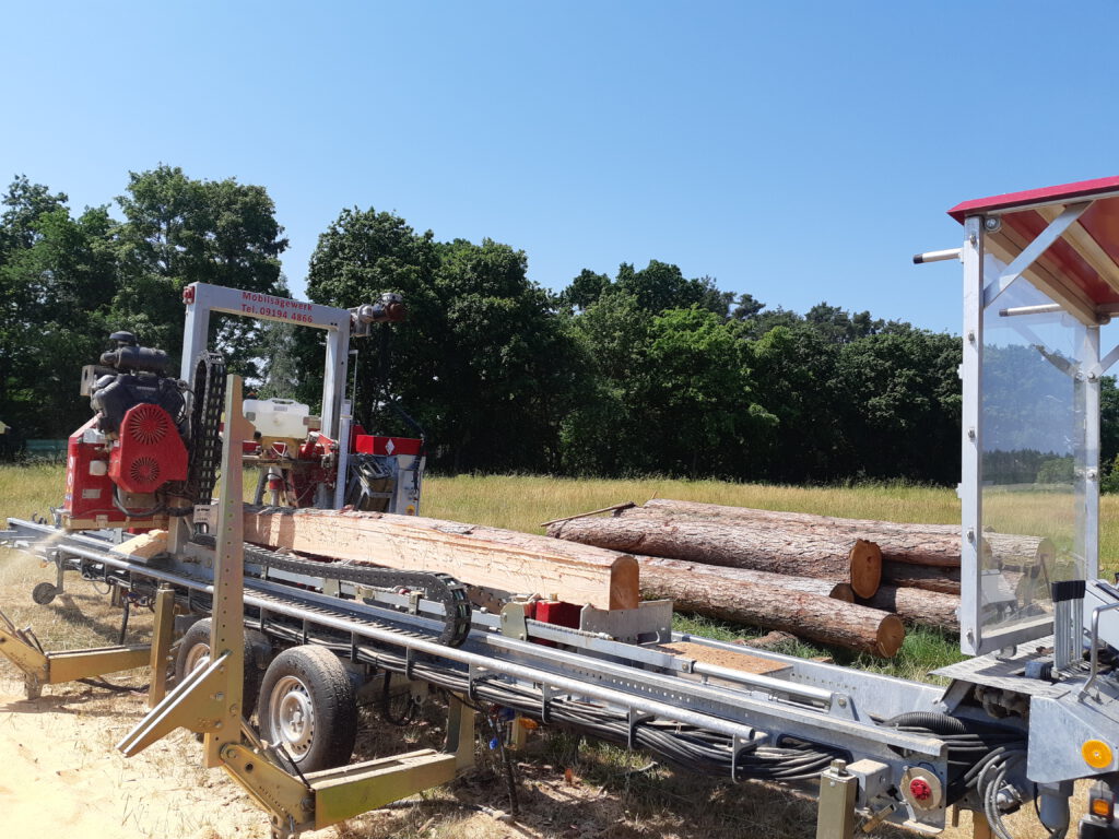 Ein mobiles Sägewerk wird direkt zum Standort des Holzes gebracht – sei es ein Waldgrundstück, ein Garten oder ein Bauplatz. Kunden müssen ihr Holz nicht erst transportieren, was oft aufwendig, teuer und mit logistischem Aufwand verbunden ist. Stattdessen wird das Sägewerk vor Ort aufgebaut und das Holz unmittelbar verarbeitet. Diese Flexibilität spart Zeit, Kosten und schont die Umwelt durch vermiedene Transporte. - Nutzung von lokalem Holz